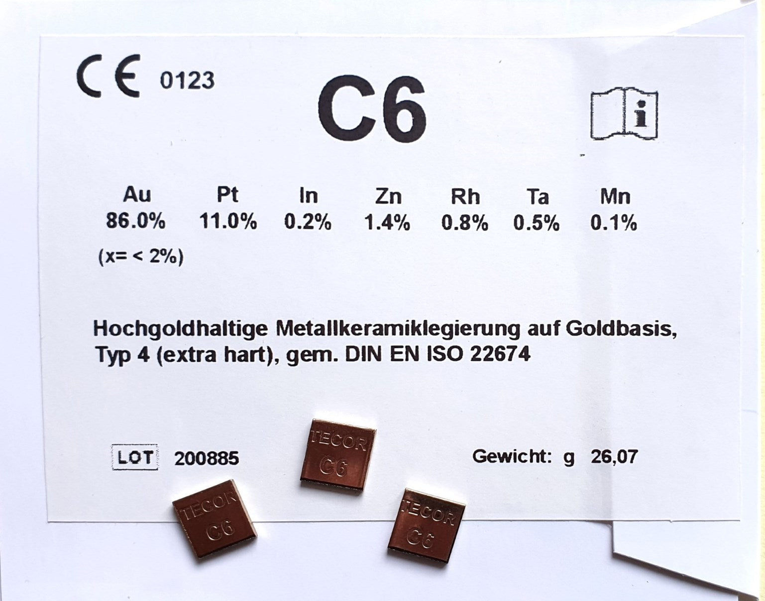 Hochgoldhaltige Metallkeramik-Legierung auf Goldbasis; Typ 4 (extra hart), gem. DIN EN ISO 22674