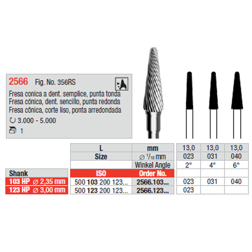 Produktdetails Hartmetallinstrument Figur : 356RS Beschaffenheit : Hartmetall Form : Konus rund ISO-Größe : 031 Konus : 4° Schaft : 103 Handstück kurz Verzahnung : Einfachverzahnung normal Die Frästechnik erfordert höchste Präzision, welche nur mit den optimalen Instrumenten erreicht werden kann. Frästechnikinstrumente für präzise Arbeitsergebnisse und hohe Oberflächengüte auf allen Materialien. Hohe Standzeiten und Schneidleistungen beim Bearbeiten von Metall, Edelmetall, Titan oder Keramik durch die optimal abgestimmten Verzahnungen und Fräserformen.