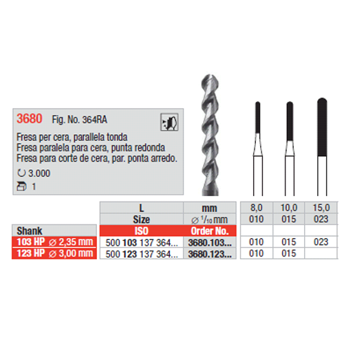 Produktdetails Hartmetallinstrument Figur : 364RA Beschaffenheit : Hartmetall Form : Zylinder, Stirn rund ISO-Größe : 023 Schaft : 103 Handstück kur   Die Frästechnik erfordert höchste Präzision, welche nur mit den optimalen Instrumenten erreicht werden kann. Frästechnikinstrumente für präzise Arbeitsergebnisse und hohe Oberflächengüte auf allen Materialien. Hohe Standzeiten und Schneidleistungen beim Bearbeiten von Metall, Edelmetall, Titan oder Keramik durch die optimal abgestimmten Verzahnungen und Fräserformen.